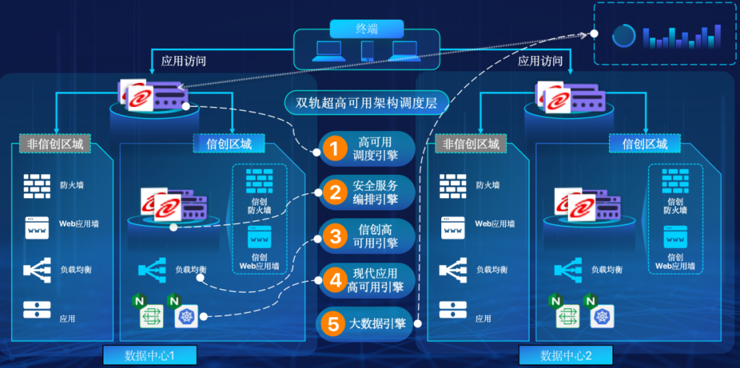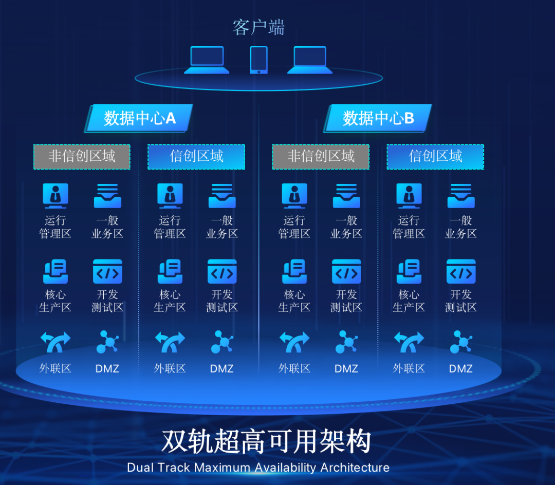 G22恒峰国际官网在企业面临自主创新IT基础重构过程中,推出的全新架构双轨超高可用架构(简称DTMAA),在双活数据中心的分区调度基础上,添加每个数据中心内信创域和非信创域的分域调度,来实现分区分域协同的多活双轨超高可用。
