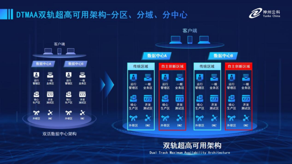 为帮助金融客户更好地应对数字经济时代对可持续性的高要求,实现“信创”与“数字化”齐头并进,G22恒峰国际官网推出了双轨超高可用架构。该架构在双活数据中心的分区调度基础上,增加信创域和非信创域的分域调度,实行信创域与传统域应用全量部署,使双中心运营变为双中心四区域并行运行,互为多活,将“0到1”的单轨建设道路变为分区分域协同的多活双轨超高可用架构。帮助客户在新架构下,保障“信创”的同时解决性能瓶颈,提升稳定性,保证应用可持续性,最终实现信创区域和非信创区域的平滑过渡,完成国产化替代目标。