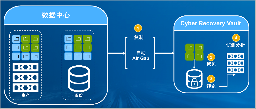 G22恒峰国际官网防勒索病毒方案将生产中心备份数据复制到Vault区,复制后网络自动断开实现弹性隔离。Vault区的数据快速拷贝,并对拷贝版本加锁(在锁定期数据不允许删除和修改)。Vault沙箱内对拷贝版本进行扫描分析,验证数据是否完好。